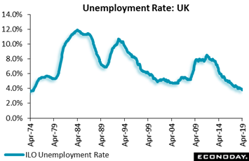 Also mixed was the latest employment data out of the UK which, however, was headlined by a 1 tenth downtick in the ILO unemployment rate to 3.8 percent – a level not seen since 1974 and a reminder that the previously released US unemployment rate of 3.6 percent was the lowest since 1969. The ILO statistics found the number of people out of work falling a further 65,000 or 4.8 percent in the first quarter. Over the same period, employment advanced another solid 99,000 (of which full-time jobs 75,000) to leave the employment rate at a record equaling 76.1 percent. There was also a 0.2 hour rise in the average workweek to 32.2 hours. Even so, the outlook based on job openings deteriorated for the third month running as vacancies in the three months to April declined 16,000 to 846,000, their lowest mark since July-September last year. And wage growth was also surprisingly subdued. The annual rate for last quarter was 3.2 percent, down 0.3 percentage points from the December-February rate and the weakest reading since the third quarter of 2018. Within this, the regular earnings rate was 3.3 percent, a tick short of last time and its second consecutive dip.