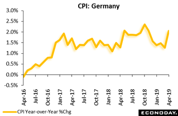 All the uneven performances underway in the global economy aren't actually surprising, unlike a jump last month in German consumer prices that very well may once again reflect nothing more than calendar shifts. Consumer prices in Germany were unrevised in the final look at April, at a sharp 1.0 percent and which lifted the annual inflation rate by 0.7 percentage points to 2.0 percent, its strongest reading since November last year. However, the CPI breakdown shows that Easter provided a significant boost. In particular, the cost of long-distance bus travel spiked 13.6 percent from a year ago while airline tickets gained 6.1 percent. Overall package holidays saw a sizeable 11.2 percent increase. Elsewhere, food was 0.8 percent more expensive, while energy rose 4.6 percent and restaurants and accommodation 2.5 percent. Excluding food and energy, prices advanced 0.9 percent on the month for a 1.8 percent yearly increase, up sharply from March's 1.1 percent. Given the apparent distortions, May's consumer price report out of Germany is likely to see a sizeable retracement. That said, the unusually large magnitude of April's jump could mean that it is not fully reversed. In any event, the May report will make for interesting reading.