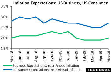 New tariff effects have yet to appear in the economic data, except perhaps for a curious jump in the US inflation outlook. Year-ahead inflation expectations in the consumer sentiment report, as tracked in blue line of the graph, had been trending consistently lower until this month, jumping 3 tenths in May to 2.8 percent in the University of Michigan's consumer sentiment data. Five-year expectations also rose 3 tenths and now are at 2.3 percent. And after holding at 1.9 percent the last three reports, inflation expectations at the business level, as tracked by the Atlanta Fed, edged 1 tenth higher to 2.0 percent in data that are also for May. In any case, the rise in inflation expectations didn't unsettle consumer sentiment which, trade war or not, jumped unexpectedly and is suddenly standing this month at a 15-year high. Inflation expectations are watched very closely by Federal Reserve officials and the rise underway supports their view that inflation is more likely to trend higher in the months ahead than it is to stay flat or move lower. Something to remember and something that runs counter to wide expectations that the next move for the Fed, however distant, is a rate cut not a rate hike.