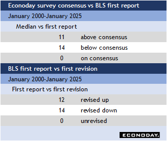 The annual revisions make forecasting the January payroll change difficult. At this writing, the early market consensus is roughly for up 50,000. Historically, the median forecast is slightly more likely to come in below consensus than above it, but that is also because there is a high degree of uncertainty in putting a number on the change in payrolls. January is typically a month to add jobs as businesses have done their end-of-year planning for staffing, college graduates join the workforce, and school systems resume operations after the winter break.