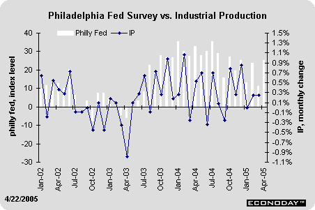The Philadelphia Fed Survey has a long history, and it does a generally good job of predicting direction in the nation's index of industrial production. Industrial production growth was highly volatile in 2004, but the trend has been more positive in the past six months. The Philly Fed survey suggests a rise in production in April.