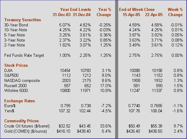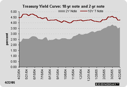 Yields were all over the board this week with large gains and equally large declines. After all was said and done, yields ended up not too different from the previous week. The 10-year Treasury note yield was nearly on par with last week's rate, although the 2-year note yield inched up a couple of basis points. It appears that bond investors are much less worried about Fed rate hikes these days because economic news has been more anemic. However, Fed Governor Donald Kohn indicated in a speech on Friday that the Fed is intent on removing "unusual" policy accommodation. Thus, the Fed is likely to continue to raise the Fed funds rate target at the next couple of meetings.