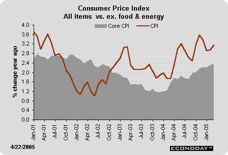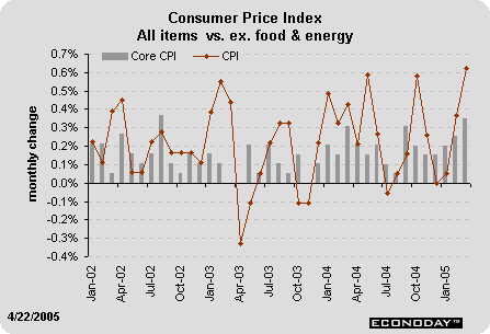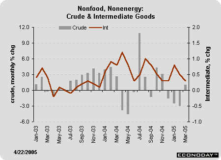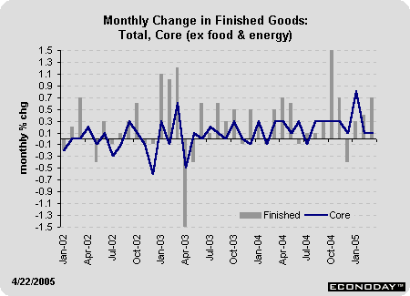 The producer price index jumped 0.7 percent in March after posting smaller gains in the two previous months. To no one's surprise, a 3.3 percent spurt in energy prices was the primary culprit behind the hike. The March rise in energy prices was more than twice as strong as February's 1.4 percent gain and puts the year-over-year rise at 15.3 percent. The energy price index in March stood roughly 50 percent above the index level for February 2002, the low point in this cycle. The gasoline price index is rising much more rapidly with prices roughly double what they were at the low a couple of years ago.
