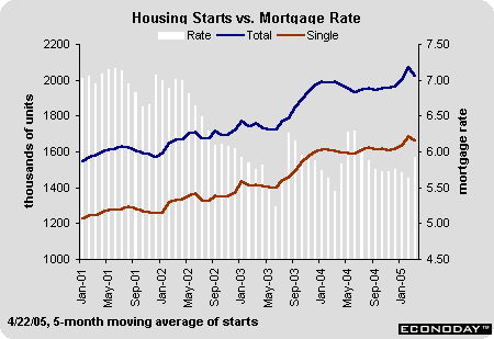 Housing starts plunged 17.6 percent in March to a 1.837 million-unit rate after rising 1.8 percent in February to a 2.229 million-unit rate. Starts were down 8.2 percent from a year ago. Single-family starts fell 14.4 percent to a 1.539 million-unit rate in March while multi-family starts plunged 30.9 percent to a 298,000-unit rate. Given the rise in monthly mortgage rates - the March average was 30 basis points higher than the February average - many economists have expected housing activity to moderate. But the March freefall was more than expected. Some economists cited unusual weather conditions during the month.