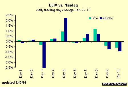 Is the Nasdaq losing steam' January was all about the Nasdaq composite index which was up 3 percent, against a meager 0.3 percent gain for the Dow Jones industrials. In the first two weeks of February, the Nasdaq declined on as many days as it rose (5 each for the first 10 trading days). In contrast, the Dow managed to post one extra up day. As a result, the Dow gained 1.3 percent in the first two weeks of February, while the Nasdaq slipped 0.6 percent. Since the end of last year, the Dow is up 1.7 percent and the Nasdaq is 2.5 percent higher, still surpassing the Dow. But the differences are narrowing.