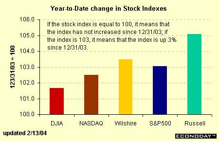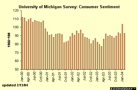 Consumer confidence had appeared to start the year on a high note with an 11.2 percentage point hike in the University of Michigan's survey for January. But preliminary figures for February show a hefty 10.7 percentage point drop. Perhaps frigid temperatures in January made for homebound and happy consumers! Taking a broader perspective, one can see that the February level is a tick higher than the December level and that January optimism was off the scale. It means consumers aren't really worse off than they've been in the past three or four months (excluding January).