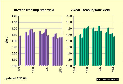 Primary dealers in the Treasury market had to take care of a quarterly refunding, involving 3-year, 5-year and 10-year notes this week, in the middle of Greenspan's semi-annual monetary policy testimony before Congress. Luckily, Greenspan's remarks were not out of line with expectations and major economic indicators weren't scheduled until Thursday and Friday. As a result, the auctions went off pretty well as the awarded yields on each of the auctions were at least 1 or 2 basis points below the when-issued (WI) trading yields. (WI trading involves trading the upcoming notes that have yet to be auctioned.) With an early close scheduled on Friday in advance of Presidents' Day on Monday, Treasury dealers were able to finish the week with slightly lower yields on the 2-year & 5-year notes and unchanged yields on the 10-year note.