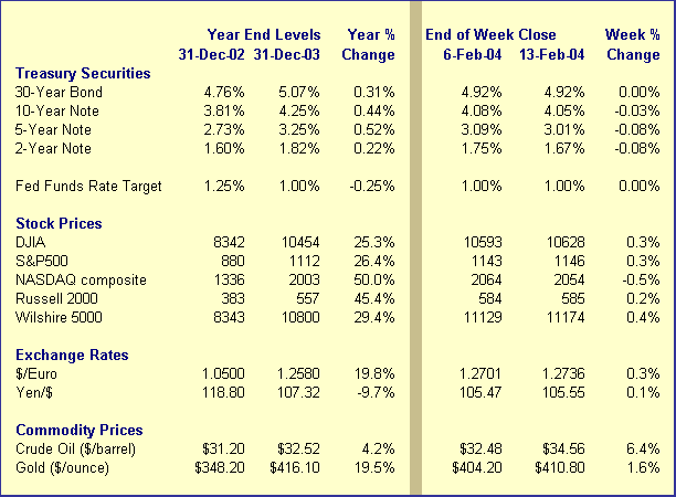 Fed Chairman Alan Greenspan dominated the news this week with comments on the economic outlook as well as the federal budget deficit and the current account deficit. His testimony suggests that the Fed is not ready to raise rates anytime soon. He noted his preference for spending cuts over tax increases in terms of reducing the budget deficit. On the whole, his comments on fiscal policy had political overtones that were probably intended not to jar the administration.