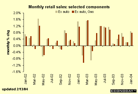 Retail sales fell 0.3 percent in January after a 0.2 percent rise in December. Sales at motor vehicle dealers plunged 3.9 percent for the month and this led total retail sales to decline more than expected. However, the non-auto component rose 0.9 percent in January, nearly twice as much as expected by economists and market players. While furniture sales and building materials sales declined, sales at clothing and accessories stores, food & beverage stores as well as restaurants, general merchandise stores and gas stations all posted healthy gains. We often discount the gas station sales when they are related to gasoline price hikes, but even after excluding gas station sales, nonauto retail sales rose 0.8 percent, the biggest gain since August and four times as much as the meager 0.2 percent gain posted in December.