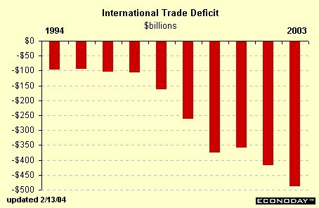 The U.S. bilateral deficit with most major countries widened in 2003 versus 2002. Oddly enough, our bilateral deficit with Japan narrowed by $4 billion in 2003, while the bilateral deficit with NICs narrowed by $1.2 billion. So much for the good news. The bilateral deficit with Canada widened by $6.2 billion; the deficit with Mexico widened by $3.5 billion; the deficit with Western Europe widened by $12.4 billion; and the deficit with China widened by $20.9 billion. The trade deficit widened sharply in 2003 despite severe dollar depreciation against the euro and other major currencies.