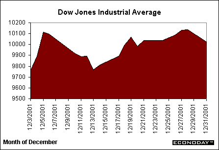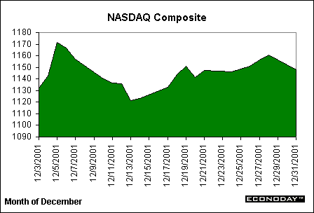 Equity investors began the month of December with high hopes for the holiday season. Optimistic market players continued the November rally and sent major indices towards gains not seen since the late summer. With stronger results from economic indicators, market players also looked towards slight gains in corporate earnings, the success of the war effort in Afghanistan, and the holiday retail-sales season as hopeful signs. Despite the reports of gains from discount retailers, it seemed that retailers were mired in a holiday slump, and this may have kept indices from performing as well as they could have. Nevertheless, most of the major indices achieved nice gains throughout the month, again, mostly on the strength of positive investors. The Dow played around the 10,000-point level before finishing above this level by the end of the volatile month. The NASDAQ continued its solid performance from the past few months, and even played around the 2,000-point mark a few times during the month.