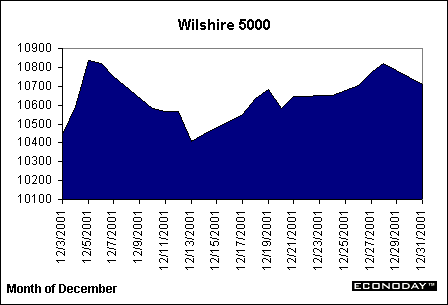 Taking a look at the year in review, equity markets were sailing on some choppy seas. A swoon that began early in the year sent indices to dramatic declines; only in the past two months have equities begun a recovery. The end of last year saw bullish investors trying to maintain some strength in equities, while this year saw bearish investors dominate. The year could basically be split between pre-September 11th levels and post September 11th levels. Markets were confused as to the direction of the economy for much of the year, but any weakness was exacerbated by the terrorist attacks on New York City and Washington D.C. September and October saw dramatic decreases in equities, and November and December saw optimistic investors hoping that equity indices had hit their lows and would bounce up for the year. By year-end, the percentage loss on the Dow was just over 7.1 percent, while technology stocks floundered, leading the NASDAQ to a 21.0 percent decline on the year. The S&P 500 lost just over 13.0 percent on the year, while the Russell 2000 was the only major index to gain on the year, up just over 1.0 percent. The market-encompassing Wilshire 5000 was down 12.0 percent on the year.