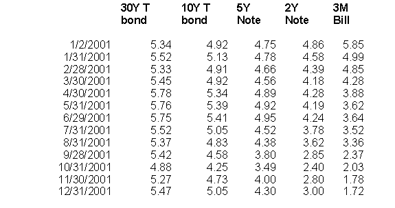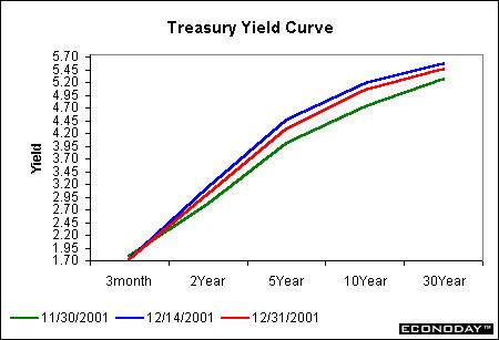 The table above depicts the variations of yields over the year. The 30-year bond and 10-year note yields each ended 2001 with a 13-basis point gain from the beginning of the year. The yield on the 5-year note fell 45 basis points, while the 2-year note yield dropped 186 basis points since the beginning of the year. But after all is said and done, the decline in Treasury yields was meager compared with the 475 basis point decline in the federal funds rate. The Fed did ease quite a bit this year, but one wouldn't know it by the modest declines in Treasury security yields.