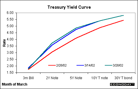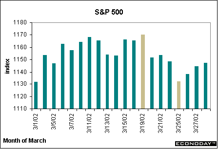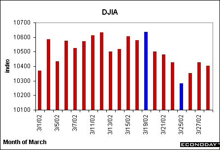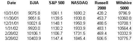 Some days of the month were particularly strong, with the beginning of March starting a rally that continued through the middle of the month. Market players kept the Dow above the 10,000-point mark for the entire month, with several triple-digit gains to begin March. The index then fell off after the March 19th FOMC meeting, when the Fed implied that rates would be increasing before the summer ended. Most of March saw stronger corporate earnings, although rate-hike pessimists dictated the market's movement for much of the month. Concerns over accounting practices in major corporations abated slightly in March, although market players are still keeping a close watch in this area. The last trading sessions of the month saw a slight burst back up, but lackadaisical investing ahead of the Easter weekend holiday kept this gain from recovering all of the end-of-month losses. Days of increases outnumbered days of declines. The Dow closed the month with a 2.9 percent gain, while the NASDAQ recorded a gain of 6.6 percent. The S&P 500 also increased, finishing up 3.7 percent for March. The Russell 2000 recorded a 7.9 percent increase, while the market encompassing Wilshire 5000 index increased 4.3 percent in March.