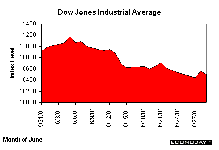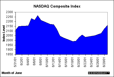 Pessimists largely dictated the market's direction during the month of June, fitting for the dog days of summer. Financial stocks dominated the downward move, and the Dow Jones Industrial Average suffered the most. June began with the Dow teetering at the 11,000 mark, while the Nasdaq Composite Index fluctuated in a 300-point range, almost but not quite reaching 2300 at mid-month. After all was said and done, the Nasdaq finished up 2.7 percent in June. Market players spent most of the month digesting earnings reports, with profit warnings proving the rule and earnings surprises providing the exception. Investors also spent most of the month looking to the June 26-27 FOMC meeting to see if the Federal Reserve would provide more relief to stock prices. When the Fed lowered the federal funds rate 25 basis points to 3.75 percent, the market reacted negatively as investors had hoped for a larger cut. Friday the 29th saw the second quarter end with small pockets of optimism for the U.S. economy and continued hopes for a rebound in corporate profits. At the end, most investors weren't looking for a full-fledged rebound until the end of the year.