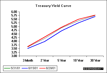The news combined to stop the Treasuries' upward trend, pushing yields higher across the yield curve for June. The 30-year bond actually closed the month 1 basis point down from its yield on May 31, while the 10-year note finished 2 basis points up. The 5-year note rose 3 basis points, the 2-year note 6 basis points up, and the 3-month bill finished June up by 2 basis points. The chart above shows that the yield curve was lower at mid-month than at the end of June.