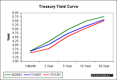 Prices of Treasury securities gained throughout the month of July as economic reports revealed that economic activity remained anemic. The data combined with Greenspan's sour testimony on the 18th to push yields down across the spectrum of maturities for the month. While July did see some days of negative Treasury movement, especially those when stocks performed well, securities basically remained on a positive track throughout the month. Market players are taking all the negative economic news from the weak employment situation to the ongoing recession in manufacturing as signs of a 25 or 50 basis point rate cut at August's FOMC meeting.