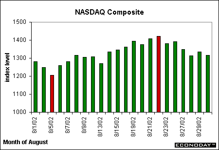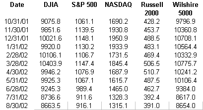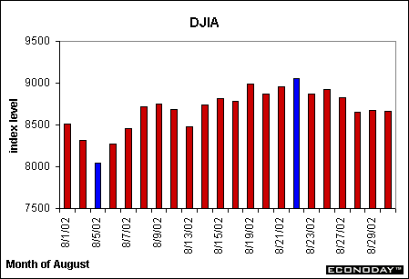 The past few months have seen some wild moves up and down, but August seemed to be a particularly interesting month for stock market investors. Equities confused investors as markets dealt with everything from large losses to a general sense that prices may be on the mend. Economic reports still confirm a slow recovery, despite growing weakness in consumer sentiment, labor markets, and manufacturing. Investors focused on corporate warnings and the threat of war with Iraq, both particularly strong market-moving events. The FOMC met and left the federal funds rate target unchanged. Their adjoining statement emphasized a slow recovery -- no help for equity prices. While mostly upbeat comments by Greenspan and other Fed officials are normally market-moving events, it seemed that equity investors, hopeful for greater guidance, ignored the policymakers.