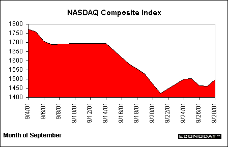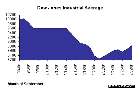 Equities began the month of September at a similar pace to that at the end of August, as volumes started increasing at the same time profit warnings continued to hit the markets. Markets, and the rest of the world, then received the shock of a lifetime, as terrorists rammed airplanes into the World Trade Center on September 11. Equity markets were shut down for the remainder of the week, set to re-open on the 17th. Before the market re-opened, the FOMC surprised the trading community by lowering interest rates by 50 basis points. Despite the assistance from the FOMC, the Dow Jones Industrial Average fell off drastically as trading began joined by every other major index. The Dow sell-off sent the index to low levels not seen in four years, down to around 8,900 points. The NASDAQ composite index also had begun the month with a low level and a mostly negative outlook, and the terrorist attacks sent the NASDAQ down to around the level before the technology run-up two years ago. Earnings warnings from technology companies also hit the market after the attack, and kept market players from ever gaining any sense of optimism or sustaining any market rallies. Investors also had to deal with mixed economic reports, and more than a handful of economists is predicting a mild recession or worse. No investors are looking forward to profits for at least six months and possibly longer.