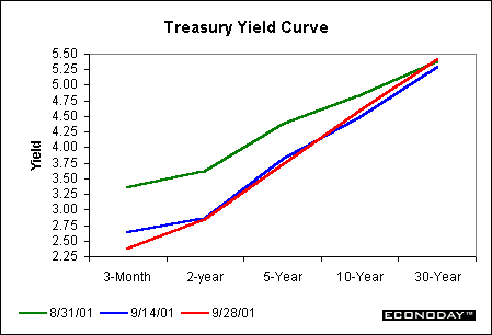 The market for Treasuries gained only slightly at the beginning of September before the attacks. Economic reports showed continuing negative conditions during the month. Then the attack occurred, and even more investors just could not get enough of Treasury securities. Yields again dove down across the yield curve. While prices of Treasury securities did show some negative movement on days that stocks performed well amidst bargain-buying opportunities, these securities maintained most of their gains through to the end of the month. The lone poor performer became the 30-year bond, which worried investors, as there was some concern over the amount of supply. Without the terrorist attacks, however there are mixed signs in the economy, as the six-month outlook begins to brighten. Other positive news for Treasuries includes the fact the FOMC remains ready to continue lowering interest rates.