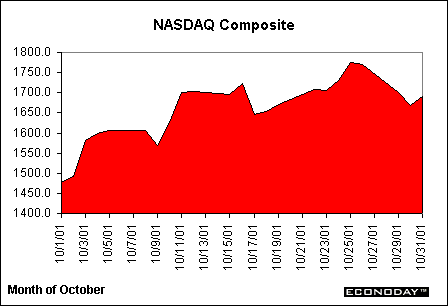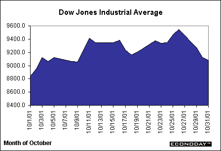 The month of October brought a mixed bag for equity markets. While market players remain optimistic towards future gains, perhaps in six months to one year, there were many days throughout the month that curtailed this positive sentiment. Economic indicators and a general paranoia hit the markets with regards to current and future terrorist threats. The negative feelings from the September 11 attacks remain in the mood of the population, and the threat of anthrax infections has everyone running scared, including market players. Despite these fears, market players were determined to move up from the low levels reached in September, and kept most of the major indices moving higher. The Dow reached past the 9,000-point level, and then fell back towards that level in the last days of the month. The NASDAQ actually had fairly good news throughout the month as the technology sector rebounded from the past few months' weakness and closed the month of October with nice gains.