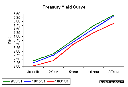 Treasury prices continued gaining steam throughout the month of October as a host of weaker economic reports had Treasury market players hopeful of continued Fed rate cuts. From a weaker employment report released at the beginning of the month, to the October 17th drop in housing starts, and finishing the month of October with a drop in third quarter real GDP generated rate-cut optimism among bond investors. As with last month's attacks, the continued terrorist threats and anthrax scares in October have market players flying to the quality of these risk-free securities. While the economy is showing some mixed signs about possible recovery in the next six months, the current situation nevertheless deteriorated in October. Treasury market investors should continue to reap the benefits of risk-averse market players and the continued volatile global situation.
