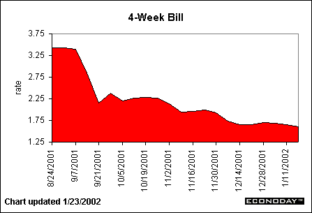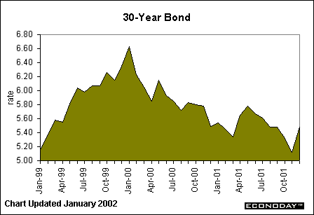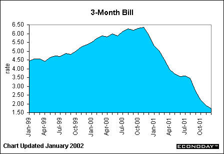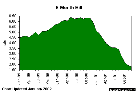 The 6-month bill, featured above, shows the same trend as the 3-month bill. It, too, has seen its yield reduced since the September 11th attacks. The yield on this security, as well as the 3-month, has been at or near lows never seen before. Of course, we haven't seen the federal funds rate target at such a low level (1.75 percent) in 40 years. Three- and 6-month bill yields tend to move in tandem with the Fed funds rate.