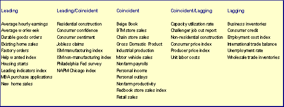 We have compiled the major indicators that are reported daily into a table that shows whether they are leading, coincident or lagging. We have also created columns for indicators that fall in between these three main headings.