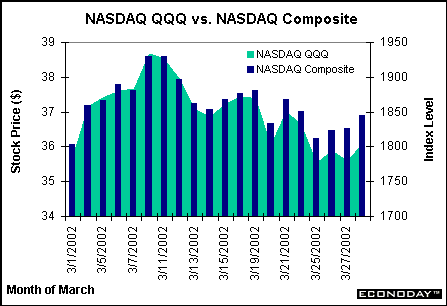 When one compares the QQQ price movement for the full month of March versus the movement on the NASDAQ, one sees that there is not a direct correlation with the index. The stock price for the QQQ generally trades in the same manner as the index, but there are some days where the movement has been in opposite directions. This suggests that while there is a relationship between the two, changes in one major stock like Microsoft or Intel may affect the entire NASDAQ Composite Index, while the QQQ may move in the opposite direction because all 100 of the stocks comprising the NASDAQ-100 are equally weighted and no one stock can affect the overall movement of the QQQ.