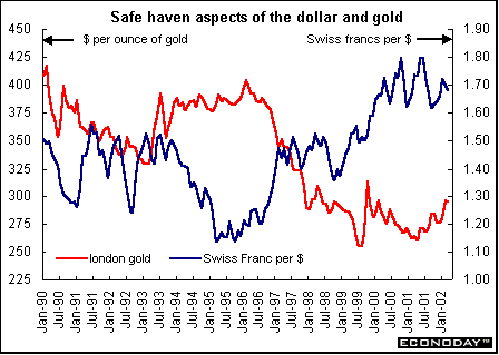 The dollar traditionally has provided a safe haven to investors in times of political uncertainty. This has been true especially during the periodic crises in the Middle East. Gold, though stuck in a long decline, has also been a traditional store of value. But due to the dollar's decline, gold has been rising steadily. The Swiss franc also has emerged as a safe haven despite the Swiss National Bank's efforts to discourage its rise in value, especially against the euro. But when things go awry, investors flock to what looks safest at the moment.