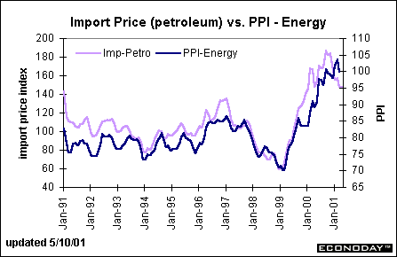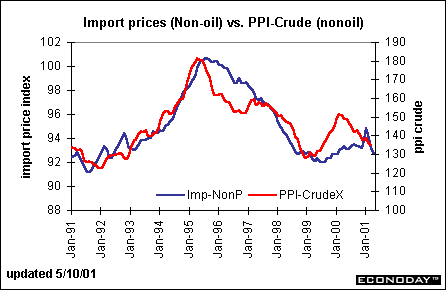 On the whole, inflationary pressures have not been a severe problem in this business cycle. The bulk of the gains in the past year have focused on energy. Indeed, as the driving season begins, consumers are once again worried about the spurt in gasoline pump prices. The import price index showed friendly news - which would be useful to see tomorrow on the producer price index. We've already seen negative inflation news this week in the form of rapidly rising unit labor costs. The Fed could certainly use some friendly news if they are going to have all the leeway they need to ease credit conditions in a weakening economy.