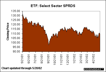 The S&P 500- related SPRDS ETF was the first to trade publicly. It has generally followed the market, with the largest declines being near the September 11th attacks. However, it is interesting to note that the price of this ETF still trades in a tight range, while if one were to invest in an S&P 500 Index Mutual Fund, one would have seen greater losses.