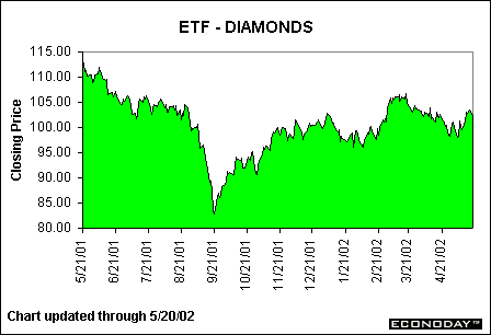 The DIAMONDS ETF encompasses the 30 major stocks trading on the Dow Jones Industrial Average. We can see that this ETF trades similarly to the SPRDS ETF above, although it is interesting that one can buy the DIAMONDS ETF at a lower price. Because the Big Board is being represented, one might have expected that the DIAMONDS ETF would be the most expensive to trade in.