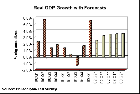 | Look at the market on any given day and you will more likely see more stock indices heading down than up. There is no question that political tensions in the Middle East and between India and Pakistan are hurting investor sentiment. Investors are also embittered by the Enron scandal and its fallout, which has heightened suspicions over companies that serve up dicey financial statements. But the impact of global tensions is usually temporary, and there's nothing new about company scandals. The most important factor behind the stock market is the economy. Granted, market prices may diverge from their fundamental values for a considerable time. Remember the irrational exuberance of the late 1990s. Stock prices surged well beyond fundamental values for more than a few years. But even then, the exuberance wasn’t baseless. Investors believed that the high tech sector would significantly increase productivity, which in turn, would benefit the economy. In fact, productivity gains were relatively modest and the full impact of the benefits of technology has not yet been incorporated into our daily lives. Nevertheless, the bull market in the high tech sector was economically motivated. This brings us to present day. Irrational exuberance has been replaced by irrational depression. It seems that economic data – whether in line with or above economists’ expectations – are just not good enough to sustain a stock market rally. Philadelphia Fed Forecast Survey The Federal Reserve Bank of Philadelphia recently released its quarterly survey of economic forecasts covering 2002 and the first half of 2003. The May survey revealed that forecasters just about doubled their estimates for real GDP growth for 2002 compared with the February survey. Economists are now predicting that real GDP will expand 2.7 percent this year compared with the 1.4 percent estimated about three months ago.  Not surprisingly, the May survey showed upward revisions to several components. Predictions for housing starts and industrial production were boosted. Stronger growth is often associated with a faster inflation rate. In fact, the CPI forecasts were slightly higher in the May survey than the February survey, but inflation remains subdued nevertheless. Stronger growth is also associated with higher interest rates. Though forecasters raised their estimates for the 10-year Treasury note, they lowered estimates for the 3-month bill. Indications from the Federal Reserve that its overnight policy rate will rise slowly are probably depressing short-term rates. But if short-term rates remain too low for too long, then inflationary pressures will emerge. Consequently, long-term rates are rising even though short-term rates are not. A faster rate of economic growth is typically associated with a larger revenue stream and improved corporate profits. In fact, forecasters reduced their estimates for profits in 2002 though they increased their estimates for GDP growth. GDP and national income are two sides of the same coin. Increased GDP growth with a reduction in profit growth implies that the income, which has to go somewhere, would head into workers' pockets. Higher wages would no doubt translate into increased consumer spending. Market interpretation It is possible that even though economists’ expectations have become more optimistic about growth, equity investors are not yet convinced that these forecasts will be realized. Perhaps investors ignored the Philadelphia Fed's report. Even though economic growth forecasts improved, economists did not revise higher their predictions for corporate profit gains in 2002. It is also possible that market players are more worried about political events than they let on. A recent Barron's article noted that many market professionals believe that another terrorist attack on U.S. soil would not only dampen stock prices, but keep them down longer than the initial attacks of September 11. The Bottom Line Today’s market environment is a difficult one in which to make decisions on stock purchases (and sales). It is certainly easier to consider buying equities when you see prices climb day after day. Yet long-term investors are more likely to profit from stock purchases when they “buy low”. In the long run, one has the best opportunity to buy low when the market is in the dumps. Certainly, the economic environment is favorable when economists are revising up, rather than down, their forecasts of economic growth. American investors, however, may be fearful of more than an economic slump. If we are looking only at a slump due to basic economic factors (too much supply that needs time to be absorbed by somewhat slower demand), investors realize that the economy and the market will eventually turnaround. However, if there is an unconscious fear surrounding terrorism in the United States, then stock prices could be depressed for an indefinite period of time. Are economic fundamentals once again being thrown out? |
