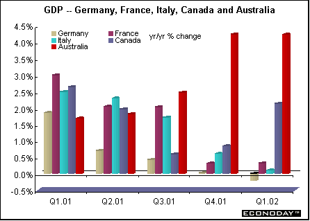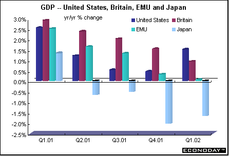| Investors are increasingly skittish about putting all their eggs in one basket. Many learned the hard way from Enron, Tyco and other scandals. It is fashionable at the moment for investors to be risk averse and to diversify their equities portfolios by industry and by geographic area as well. This diversification is playing a role in the dollar’s weakening and sinking U.S. stock indexes as foreign investors keep their money closer to home. But it seems that before spreading one’s portfolio willy-nilly geographically, it is a good idea to know a little about what is happening overseas and whether the elements of growth are there to support risk averse portfolios. The investor might not be spreading risk but increasing it. To illustrate the wide range of worldwide growth rates, the two graphs below show recent year over year growth rates for the major industrialized economies. In the first graph are the United States, Britain, the European Monetary Union and Japan. The second graph includes the EMU’s three largest economies — Germany, France and Italy — plus Australia and Canada.  Asia Australia — The Australian economy has proven to be very resilient despite the worldwide growth slowdown. Strong domestic demand, especially for housing helped. Australia's economy expanded in the first quarter, spurred on by consumer spending, a construction boom and a recovery in exports. The lowest mortgage rates in three decades plus an A$10,000 government handout to first home builders boosted residential construction 27.8 percent in the first quarter from a year ago. That spending spilled over to more purchases of household furnishings and electrical appliances. Because of the vigorous growth, the Reserve Bank of Australia has already raised key interest rates in the face of rising prices. Japan — On a quarterly basis, Japanese first quarter GDP bounced into positive territory after three negative quarters. Growing exports are largely responsible for the bounce, which helped reduce the inventory overhang and even raised industrial production to meet demand, especially for autos. Japan is the only major industrial country to experience negative year over year growth for the past four quarters. Japan's latest downturn — by most reckonings its third in the past decade — has been particularly nasty. However, there is disagreement over how long the latest rebound can last, given that it is driven by exports that account for just 10 percent of GDP.  Europe EMU — For the combined 12 countries that make up the European Monetary Union, GDP barely escaped a decline in the first quarter and crept up a mere 0.1 percent when compared with last year. While all of the big three — Germany, France and Italy — suffered third quarter declines in the aftermath of September 11, France bounced back quickly on the strength of domestic demand. However for the EMU as a whole, this was outweighed by two quarters of falling GDP in Germany, the EMU’s largest country. Italy too, weighed on overall growth. Many of Germany’s economic ills can be traced back to German reunification in 1989-90. However, appropriate economic policies to deal with the unification’s aftermath were not developed. Instead of reforming the rigidities in west Germany’s bureaucratic capitalism, they were exported to the east. More than four million Germans are unemployed, public finances are under intense pressure, and the promised growth springboard has failed to bounce. The result has been an economic imbalance that has snuffed out any chance of a self-sustaining upswing in the east and is making the unification of the two unequal parts far more expensive than even the pessimists feared. Germany’s economic woes have had global repercussions. They have placed a huge strain on the United States as the world’s sole economic locomotive. And because Germany is the main trading partner for most European countries, the EMU as a whole is on a low growth trajectory. Although Germany returned to growth in the first quarter, thanks largely to exports and the weak euro, the country lost ground when compared with a year ago. And labor strife is impeding any acceleration of growth. However, France — partly because it feared German power — has been far more successful than Germany in introducing structural reforms such as the 35 hour week and has promoted growth, competitiveness and employment. The strength of the consumer in France is good news for the European Central Bank. The bank's president, Wim Duisenberg, said that consumers will play a large role in determining the strength of the economic rebound this year. Optimism among Italian businesses rose to the highest level since the beginning of last year. But this has not helped to get the Italian economy on track. GDP growth has petered out since the first quarter of 2001 to barely eke out 0.1 percent growth in the first quarter when compared with last year. Inventories rebounded and accounted for virtually all of the increase, offsetting declines in domestic demand, capital investment and exports. Britain — Growth here has been fostered by a strong service sector while the manufacturing sector has been in recession, thanks to their strong currency versus the euro. However, first quarter GDP remained unchanged when compared with the previous quarter while the economy grew by one percent when compared with last year. Manufacturing is finally showing signs of revival. But in Britain as in the United States and Australia, the hero has been the consumer, who continued to buy through thick and thin. And an exuberant housing sector has done its part to stimulate ancillary purchases. Americas Canada — The Canadian economy has held up well during the past year. Often, the Canadian economy is considered the stepchild of the U.S. economy. But that hasn’t been so since the third quarter of 2000. In each quarter since then, the Canadian economy has outgrown the United States when c