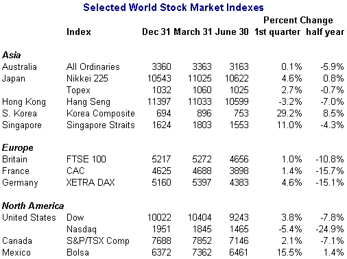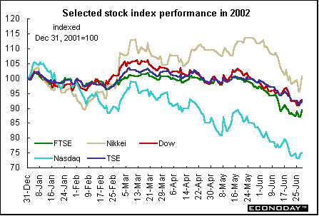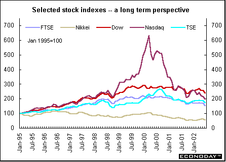 | An abysmal performance No one is sorry to see the second quarter of 2002 fade into history. With it came new short-term lows for global equities comparable to those seen after the September 11 terrorist attacks. Investors, already dealing with scary geopolitical and terrorism issues, were pushed over the edge by the uninterrupted barrage of corporate malfeasance. Now investors don’t trust any news, even if it is good. With suspicion lurking around every corner, investors can only dream of a return to pre-millennium days and double-digit returns. Stepping back to the long-term, the graph below shows the Nasdaq suffering greater fluctuations than the Dow Industrials, Nikkei, London FTSE or Toronto S&P/TSX composite.  The dollar matters Global stock performance, or the lack of, shows some correlation to the slumping value of the dollar. If the dollar is falling because U.S. investments, especially equities, are so unappealing, where are investors putting their money? Certainly not in stocks in Europe, Britain or Japan! Stocks there are being hammered as well. Not only do offending companies get pummeled, but companies that share the same sector get roughed up as well. The dollar has been following the equities markets for the most part as investors overseas — and those in the United States — take a dim view of economic growth and corporate shenanigans. The dollar has lost over 11 percent against the euro and 8.5 percent against the yen since the first of the year. Is it a case of selling U.S. assets without re-investing the proceeds back home? Being overlooked by market players are economic growth prospects. Europe is lagging the United States in growth, while growth is questionable altogether in Japan. Until recently, the United States could do no wrong. Now the slightest change in the U.S. outlook is an excuse to sell. Theoretically, a strong euro should mean investors elsewhere in the world (but mostly the United States) would start buying eurozone stocks, sending prices up. In practice, U.S. Treasury statistics show that Americans continue to be net sellers of European equities. U.S. investors may be disenchanted with their own companies, but they aren't in love with European ones either. Many analysts believe that U.S. investors tend to look for growth opportunities, which have traditionally been found at home and not in overseas markets. Nor can a rising euro be expected to improve profits of European companies. Many European companies have been exporting as much as they can to the United States and have become heavily dependent on these sales. It is estimated that dollar-related revenues account for 30 percent of corporate Europe's income.  Where/when will it end? First there was Enronitis. That was followed by Tycosis. At second-quarter’s end, we have yet more blockbuster corporate malfeasance — WorldCom (with a little Xerox on the side). Bad news and uncertainty have always rattled investor confidence. The table below gives the dismal statistics for the first half of 2002.  In Britain, the FTSE 100’s first-quarter gain turned into a first-half loss to the tune of 10.8 percent. Directional changes in indexes tend to be influenced by the trading direction of U.S. stocks. The London FTSE 100, Paris CAC and Frankfurt DAX swooned in May and June as they continued to track the U.S.'s ups and downs. The Frankfurt DAX, which was also on the plus side at the end of the first quarter, reversed direction to lose 15.1 percent by June 30. The Paris CAC extended its downward trend of the first quarter and closed out the first half of the year with a loss of 15.7 percent. Contributing to the declines was overall anemic economic performance in Europe. Whatever growth occurred came essentially from exports. And even though analysts think that U.S. growth slowed in the second quarter from the unsustainable pace of the first quarter, the European outlook still lags that of the United States by a considerable margin. Most Asian indexes followed here did not suffer the reversals that occurred in Europe, Canada and the United States. The hero in Asia remains the South Korean Kospi, although it was not immune to the downward slide in global stocks. The index still managed to be up 7.1 percent at second-quarter’s end. However, this compares unfavorably to the heady 32.3 percent gain that the Kospi recorded at the end of the first quarter. The Nikkei has given back most of the appreciation that occurred prior the close of the Japanese fiscal year on March 31. Although the Nikkei barely had its head above water, up 0.8 percent at the end of June, it had lost most of its 7.5 percent first-quarter rise. Ironically, the Nikkei outperformed U.S. and European indexes primarily because of strong exports to the United States and a favorable exchange rate. In the Americas, investors’ confidence, which was edgy already because of political and terrorist uncertainties, has been severely eroded by the continual onslaught of corporate travesties. Doubts about accounting U.S. style have made investors very skeptical of any earnings statement. Now, only the Mexican Bolsa stands — just barely — above year-end levels. The bursting of the technology and telecommunications bubble has pushed the Nasdaq down to ever-lower levels. It has now lost 24.9 percent when compared against year-end 2001. The Dow and the Toronto S&P/TSX composite have dropped 7.8 percent and 7.1 percent respectively. Stocks continue to be brutally punished at each new corporate revelation. Bottom line Worldwide equities for the most part have been declining for 2½ years and counting. Traditionally, a rise in equities precedes economic recoveries by about six months. But not this time. Recent declines have been in the face of an improving U.S. and world economy. Investor woes can be blamed on the hubris of corporations and accounting firms, the outbreak of hostilities in the Middle East, the always threatening situation in near Asia