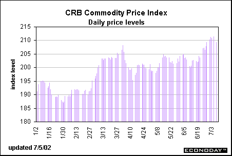 Commodity prices are running up again after stabilizing over the past several months. But even during the April-to-June plateau, the CRB commodity price index was well above price levels recorded in the first few months of this year. Price hikes are generally seen on commodity price indexes before they show up in the producer or consumer price index. It's one of the reasons that many investors - and Fed officials - keep a close eye on daily commodity prices as well as the price component of the monthly ISM manufacturing report.