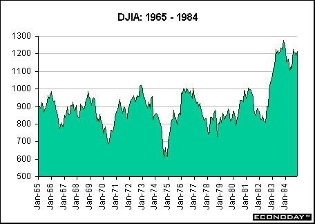 The picture surely looks very different when looking at the 20-year period from 1965 to 1984. Granted, this period does include four recessions (1969-70, 1973-75, 1980, 1982-82), nevertheless, the stock market wasn't always climbing. For instance, the market tumbled in 1966 when a credit crunch softened the economy without pushing it into recession. The market also dropped sharply between 1976 and mid-1978, a period of accelerating inflation. But quick recoveries were the rule, leading to volatility premiums that investors accepted. Stock market returns were good, but they weren't associated with a free ride in the same way as they were in the 1990s. Incidentally, while the recovery beginning in 1983 (following the 1982-82 recession) certainly was accompanied by a stock market rally, the DJIA peaked in 1984 and the market retraced its steps for several months even as the economy continued to expand. This is just one example supporting the quip that the stock market has "predicted" nine of the past five recessions.