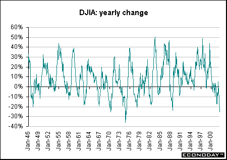 The chart below depicts the year-over-year change in the DJIA back to 1946. Every upturn was followed by a downturn and vice versa. The 1990s experienced a particularly long upturn that has been justly labeled a period of irrational exuberance. The current downturn shouldn't have been unexpected, nor does it appear out-of-whack with historical trends.