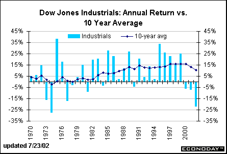 The chart below shows annual rates of return coupled with the 10-year moving average of the Dow. Assuming that we end 2002 at today's levels, the Dow would still show a 10-year average yearly return of 10.4 percent. No, it isn't as good as the 33.5 percent rate of return posted in 1995, but it isn't bad for the long haul.