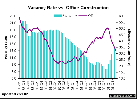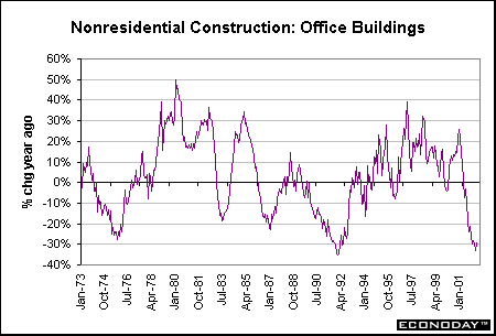 Outlook for office building construction: Office building construction expenditures peaked in the fourth quarter of 2000. Following the pattern of a two-year downward trend, we should expect continued weakness until year-end. Office vacancy rates have risen sharply in the past two years, but are nowhere near the highs of the mid-1980s. We could look for a bottom in office building construction before the end of this year.
