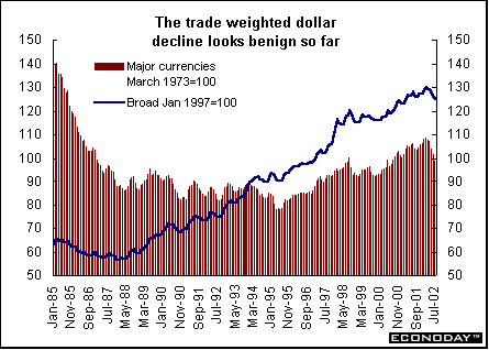 The dollar has declined in value over the past several months, especially against the euro and the yen. But does this really matter to the U. S. economy and to investors? Views on the subject vary as widely as do the reasons for the dollar's decline. Some depend on whether you live in the United States and whether you think that the current account deficit really matters. While most of the market chatter centers on bilateral interest-rate differentials, the trade weighted dollar index (graph below) allows for comparison against a basket of currencies.