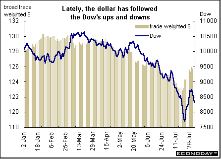 The dollar has fluctuated nearly in lockstep with equities - rising in value when the Dow rises and vice versa (see graph below). But there are other reasons contributing to the dollar's decline. From the perspective of overseas investors, the dollar is vulnerable to even small changes in sentiment. With the current account deficit (that is, the balance of merchandise trade and services and investment flows with the rest of the world) set to top $450 billion in 2002, the United States needs to attract huge fund inflows every working day in order to prevent the dollar from falling. Investors and central banks do not necessarily have to sell the dollar for it to go down - all they have to do is slow their purchases of U.S. assets. In the 90's merger frenzy, for example, European companies were snapping up U.S. assets as a vehicle to gain entry into the seemingly insatiable U.S. market. These days are long gone.