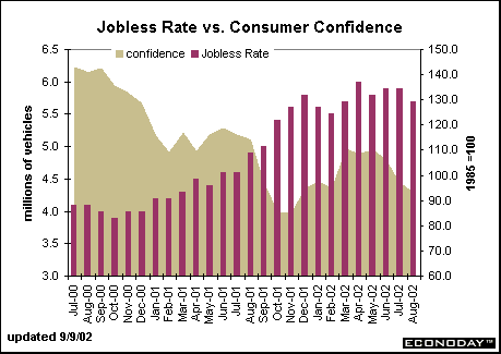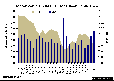 When consumer confidence is affected by special factors, such as the terrorist attacks or a stock market plunge, it can recovery quickly. Sharp declines might have only minor effects on spending. The Conference Board's consumer confidence index asks key questions regarding labor market conditions. Consequently, this index tends to rise and fall with the labor market, more so than the University of Michigan's consumer sentiment index which is geared toward questions on personal finances. One would certainly expect that long-term negative trends in the labor market - a rising unemployment rate for instance - would lead to falling consumer confidence. In turn, if consumers feel that their jobs are on the line, then they are less likely to purchase large ticket items such as motor vehicles. In fact, confidence was near its peak for this cycle at the same time the unemployment rate bottomed out. But consumer confidence began to turn around immediately after the attacks even as the unemployment rate stabilized. The corporate scandals took a toll on confidence, as the index again began to decline in the spring, even as the unemployment rate remained in a tight range.