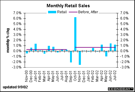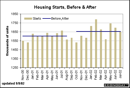 Based on conventional wisdom among equity and bond market participants, the declines in consumer confidence would have suggested a sharp drop-off in purchases of large ticket items such as cars and SUVs. In fact, in the 10 months after the terrorist attacks, motor vehicle sales averaged 13.9 million units, a tick higher than the 13.8 million-unit rate recorded in the 10 months prior. Counting the August data, the average selling pace since October was a 14.1-million-unit pace. Granted, automakers devised (and still are devising) dramatic incentives to drive customers back to the showrooms, but nevertheless, consumers were willing to buy. If confidence had really been an issue, even the zero-percent financing incentives wouldn't have been enough to entice buyers.