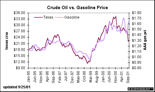 If you look closely at the chart below, you'll see that crude oil prices in the neighborhood of $21 - $22 per barrel were associated with unleaded gasoline prices around $1.30 per gallon. Given that the AAA survey showed gasoline prices averaging $1.63 at mid-September, this means that gasoline prices should fall at least 30 cents per gallon - and might decline more if crude oil prices continue to decrease. The drop in gasoline prices will help put more disposable income in the pockets of consumers. With a weekly fill-up of 10 gallons, a 33-cent reduction would amount to $3.30 per week - accumulating to just over $13 per month. That doesn't seem like much, but it is the cost of a movie ticket plus popcorn at the theater!