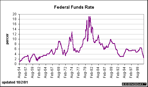 The FOMC announced a 50 basis point rate cut at the end of their meeting on Tuesday, bringing the federal funds rate target down to 2.5 percent and the discount rate to 2 percent. In the past year, the Fed has reduced the federal funds rate target by 400 basis points to its lowest level since February 1962. Along with the rate cut, the Fed issued a statement saying that the September 11 terrorist attacks "significantly heightened uncertainty in an economy that was already weak." The larger degree of uncertainly is expected to dampen further business and household spending. Fed policy makers maintained their bias toward easing.