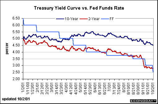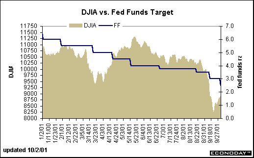 Stock investors were expecting a rate cut of 50 basis points on Tuesday, and got their wish granted. Typically when market expectations are met, stock prices won't necessarily rally, but the Dow posted a healthy 113-point gain on Tuesday afternoon after the rate cut announcement. But underlying sentiment did not change in the equity market. Investors want to see an economic recovery that will generate some corporate profits. It is certainly possible that the market has already tested its lows for this cycle, but uncertainty is heightened these days. Most likely, September data (reported in October) will be affected by the terrorist attacks but won't be decisive in its meaning. But if October data (reported in November) show some signs of life, perhaps the stock market will also.