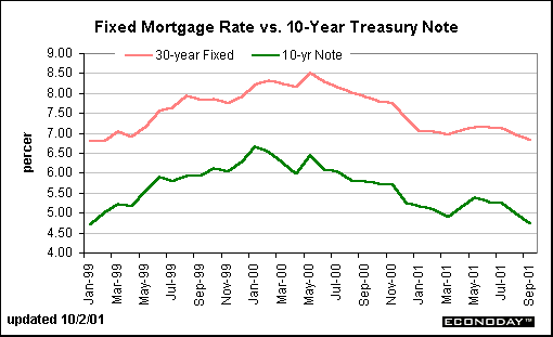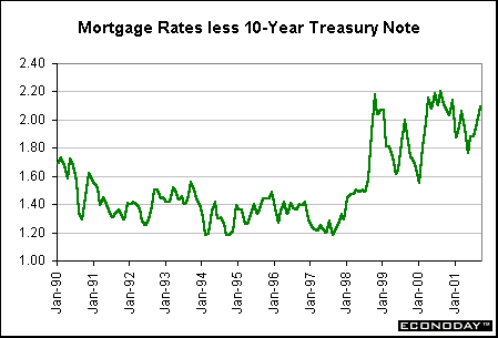 One would expect mortgage rates to move in tandem with the federal funds rate, but mortgage rates are tied to Treasury yields. Mortgage rates have come down with yields on the 10-year Treasury note, albeit not by the same magnitude. Since May 2001, the spread between the 10-year Treasury and the 30-year mortgage rate climbed 31 basis points. Notice that this spread is not at an all-time high; a break occurred in this series in late 1998-99 when the spread between 10-year yields and 30-year mortgage rates increased by as much as 60 to 80 basis points. The break followed the Treasury's announcement to reduce supply due to reduced government borrowing, causing yields on Treasury securities to fall back sharply.