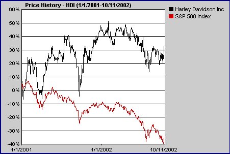 This summer's stock market collapse brought Harley once again within her reach. But all the negative market psychology made my friend nervous; she put off evidence of consumer strength, all her friends who were buying big-ticket items -- furniture, cars and of course motorcycles. In the midst of a declining stock market, she saw the Harley price either hold stable or rise. Monday was the final straw when Harley closed at $52.15 up $2.00 from the Friday close - a full $7 dollars from her buy target. Eating dust again!